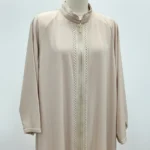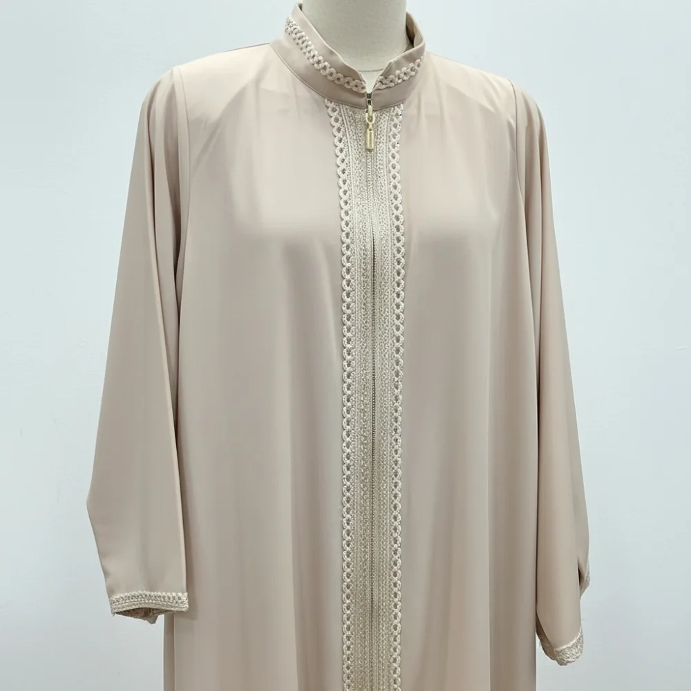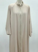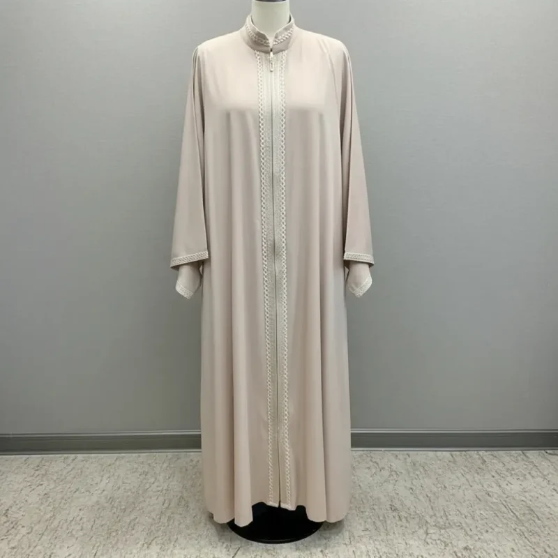 عباية بيج بسحاب أمامي وتطريز على الياقة والأطراف