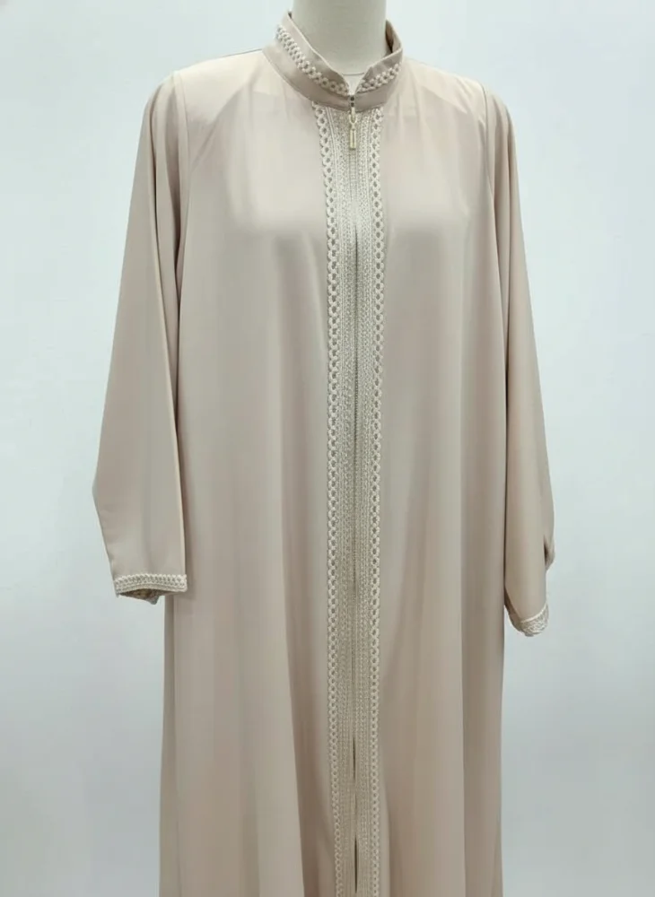 عباية بيج مغلقة بسحاب أمامي كامل وتطريز ناعم يزيّن الياقة والأكمام.