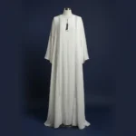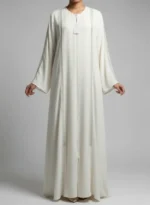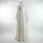عباية أعراس بيضاء بتصميم راقٍ مستوحى من العبايات الفخمة، بقصّة واسعة ومستقيمة بطول كامل تناسب مختلف أشكال الجسم وتمنحك راحة في الحركة طوال يوم العرس.