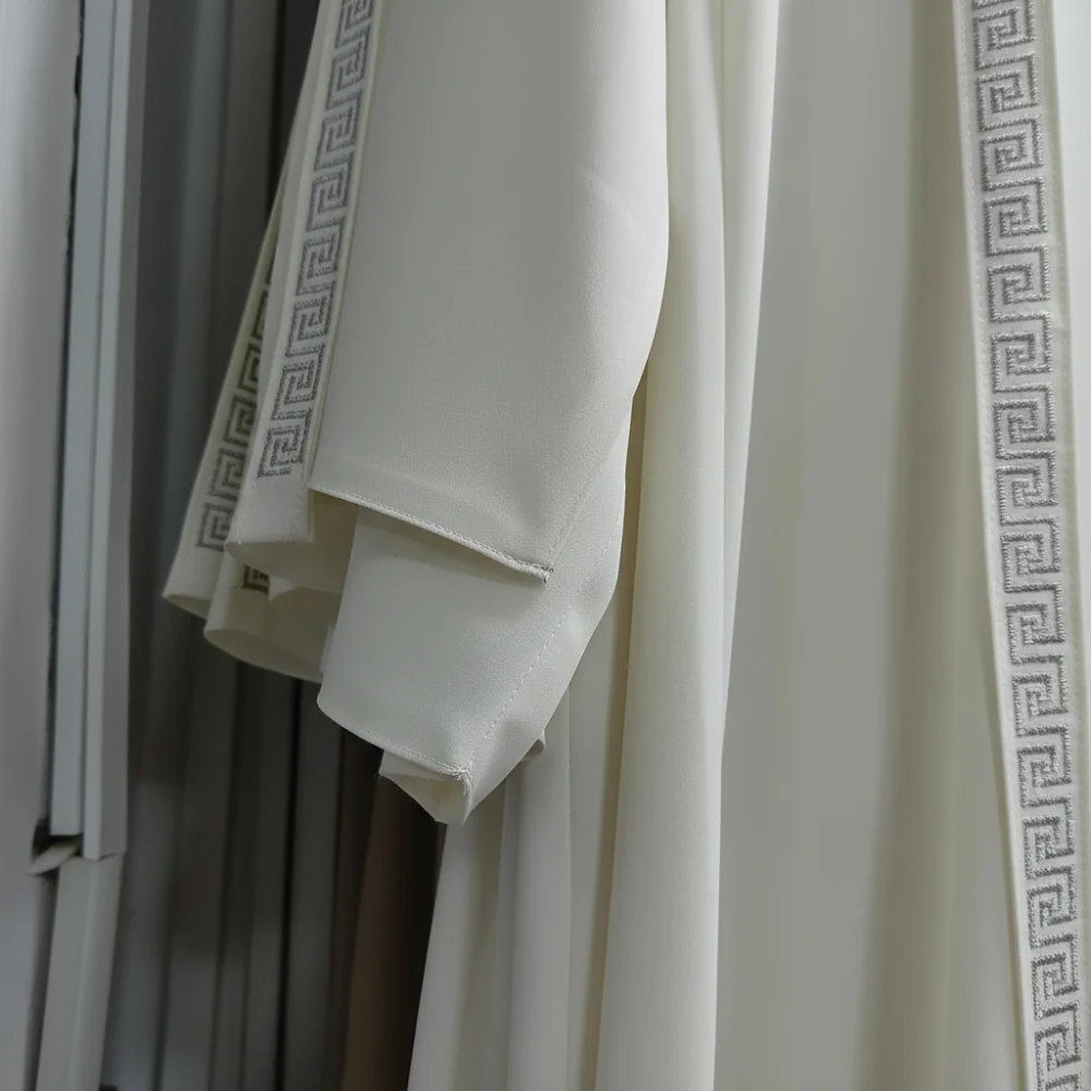 تأتي بتطريز فضي ناعم على طول الجانبين والأكمام، يضيف لمسة فخامة دون مبالغة، مع فتحة أمامية أنيقة يمكن تنسيقها مع فستان أو بدلة بيضاء بسيطة تحتها.