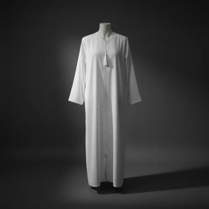 العباية مصنوعة بقصّة مستقيمة تسمح بحركة سهلة، مع تفصيل بسيط في خط الخياطة الأمامي، وشرّابة صغيرة تضيف لمسة لطيفة دون تعقيد. النسيج خفيف ومناسب للاستخدام في مختلف الفصول.