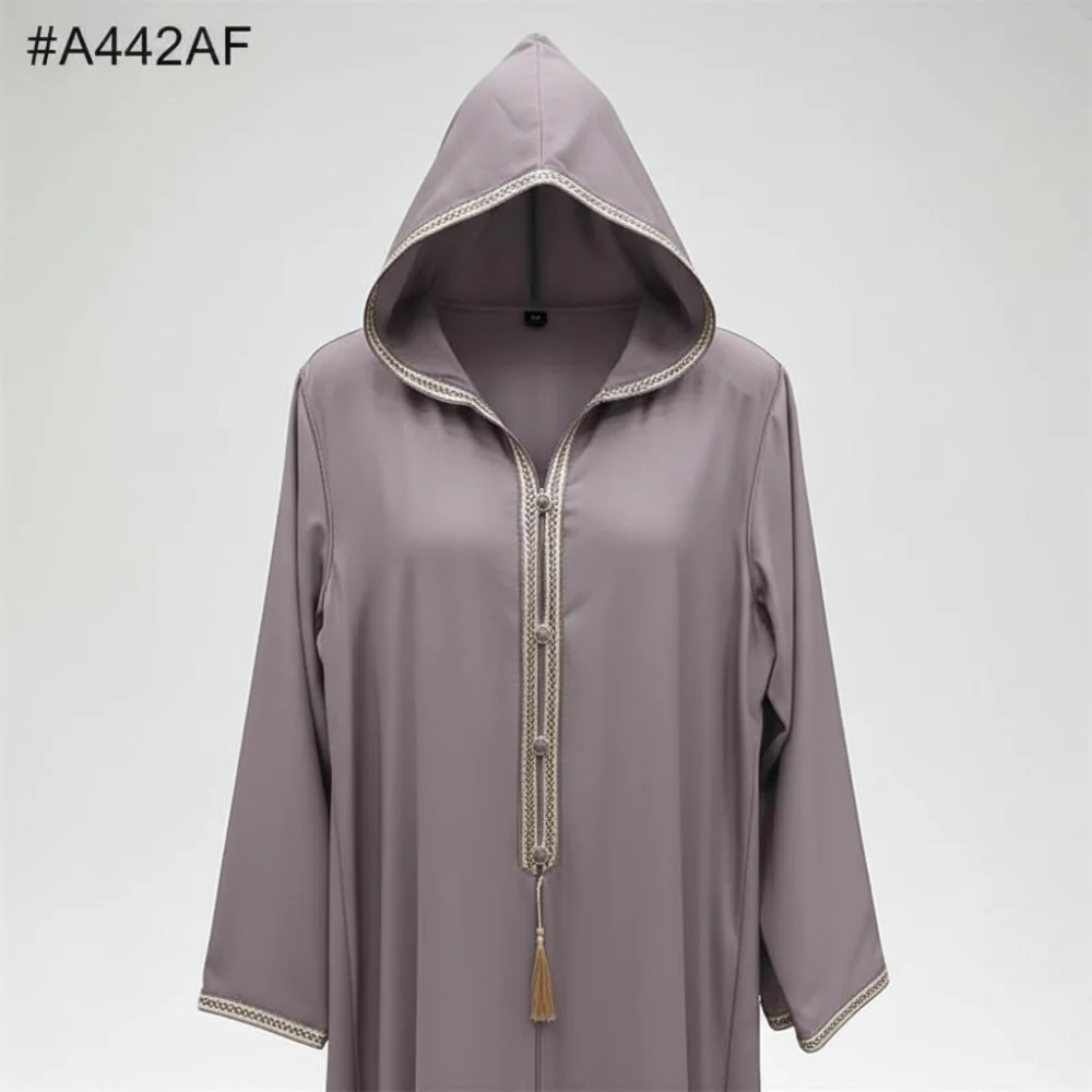 تصميم مغربي أصيل: قصة واسعة مع “قب” (غطاء رأس) يضيف طابعاً تقليدياً محبباً وعملياً.