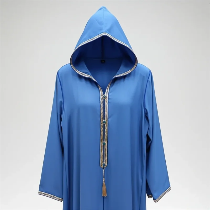 • تصميم مغربي أصيل: قصة واسعة مع “قب” (غطاء رأس) يضيف طابعاً تقليدياً محبباً وعملياً.