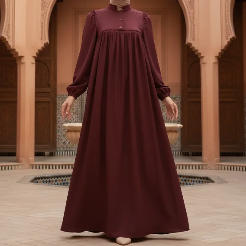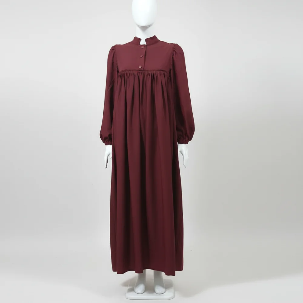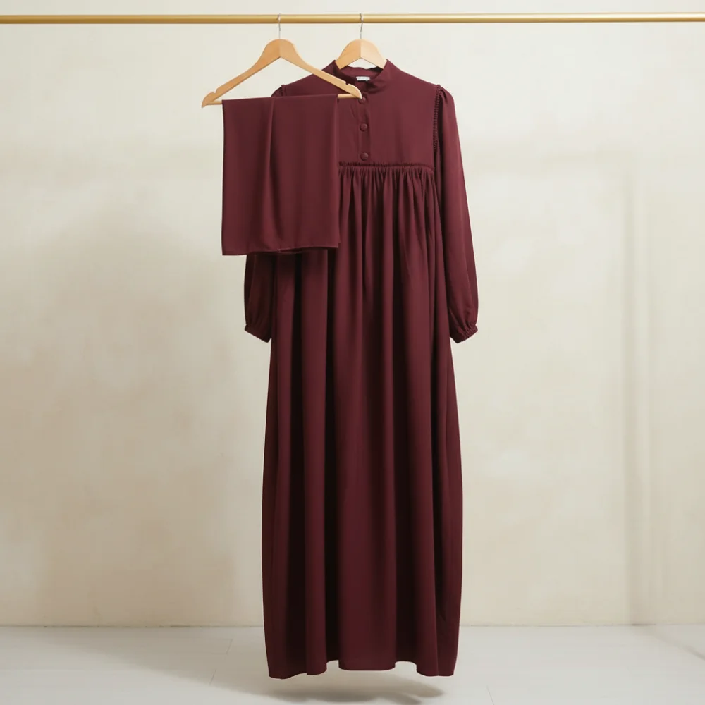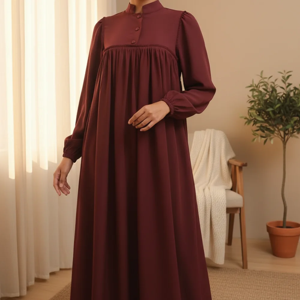 حجاب طويل واسع بتصميم محتشم، يتميز بياقة واقفة مع أزرار أمامية وقصة صدر مجمعة، إضافة إلى أكمام طويلة بنهاية مطاطية.