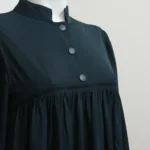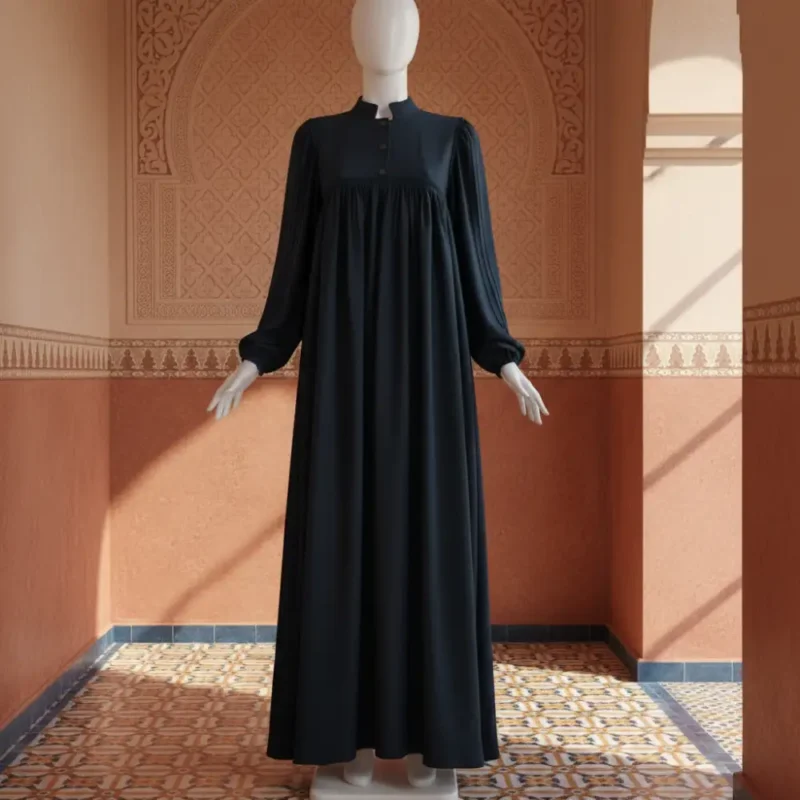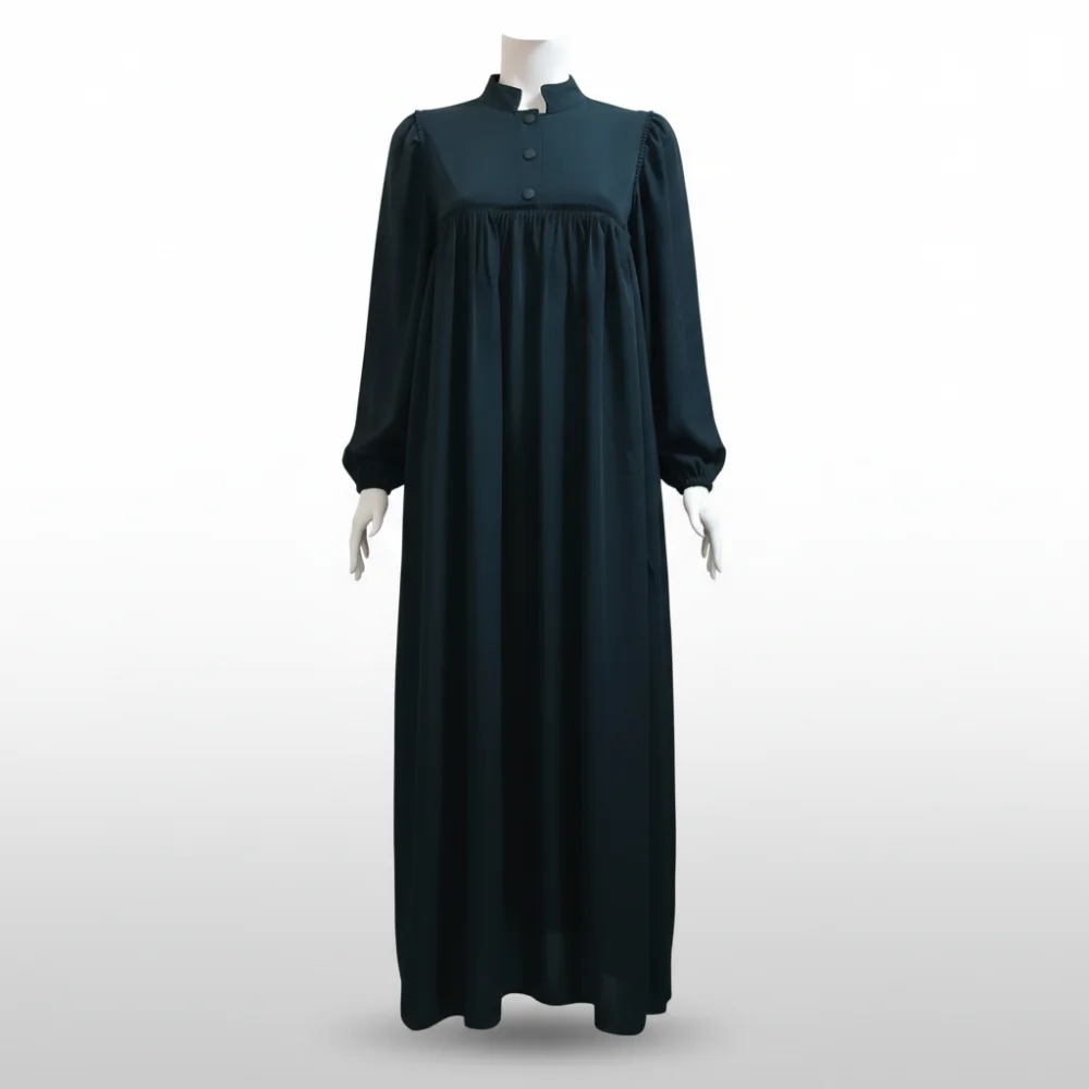 حجاب طويل واسع بتصميم محتشم، يتميز بياقة واقفة مع أزرار أمامية وقصة صدر مجمعة، إضافة إلى أكمام طويلة بنهاية مطاطية.