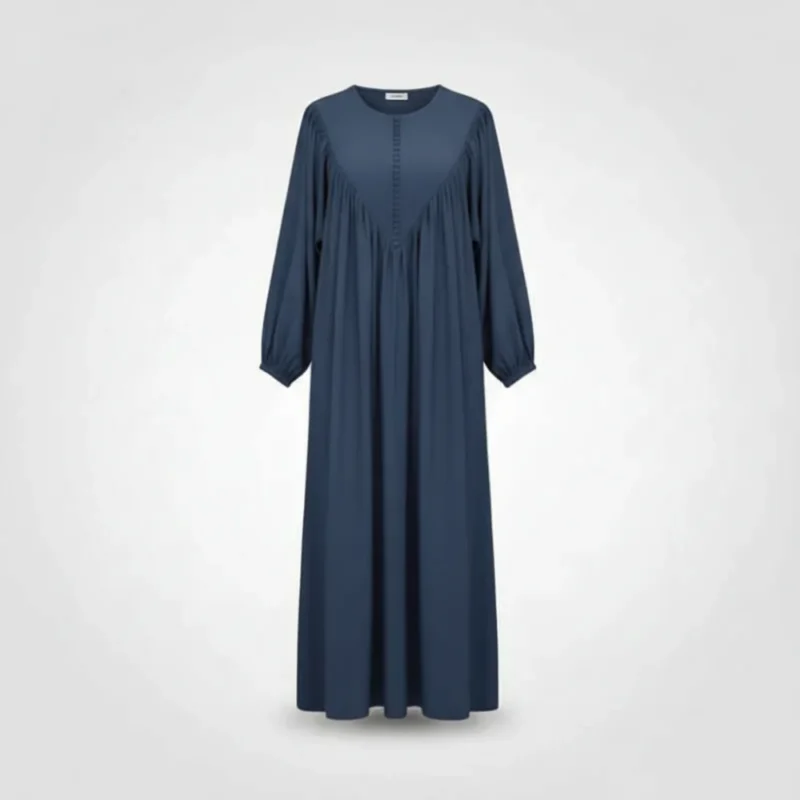 إذا كنتِ تبحثين عن قطعة تمنحك حضوراً مميزاً وراحة مطلقة، فإن موديل “V” هو خيارك الأنسب. الاعتماد على قصة الـ “V Shape” في منطقة الصدر ليس مجرد شكل جمالي، بل حيلة ذكية تعطي الموديل اتساعاً كبيراً من الأمام (Gathers) ليناسب جميع القياسات ويخفي تفاصيل الجسم ببراعة.