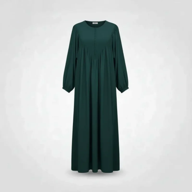 - أكمام عملية: أكمام طويلة واسعة تنتهي بمطاط (Elastic) لتكون مريحة وعملية، وتكمل فخامة التصميم.