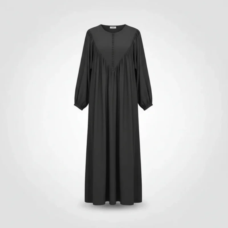 - أكمام عملية: أكمام طويلة واسعة تنتهي بمطاط (Elastic) لتكون مريحة وعملية، وتكمل فخامة التصميم.
