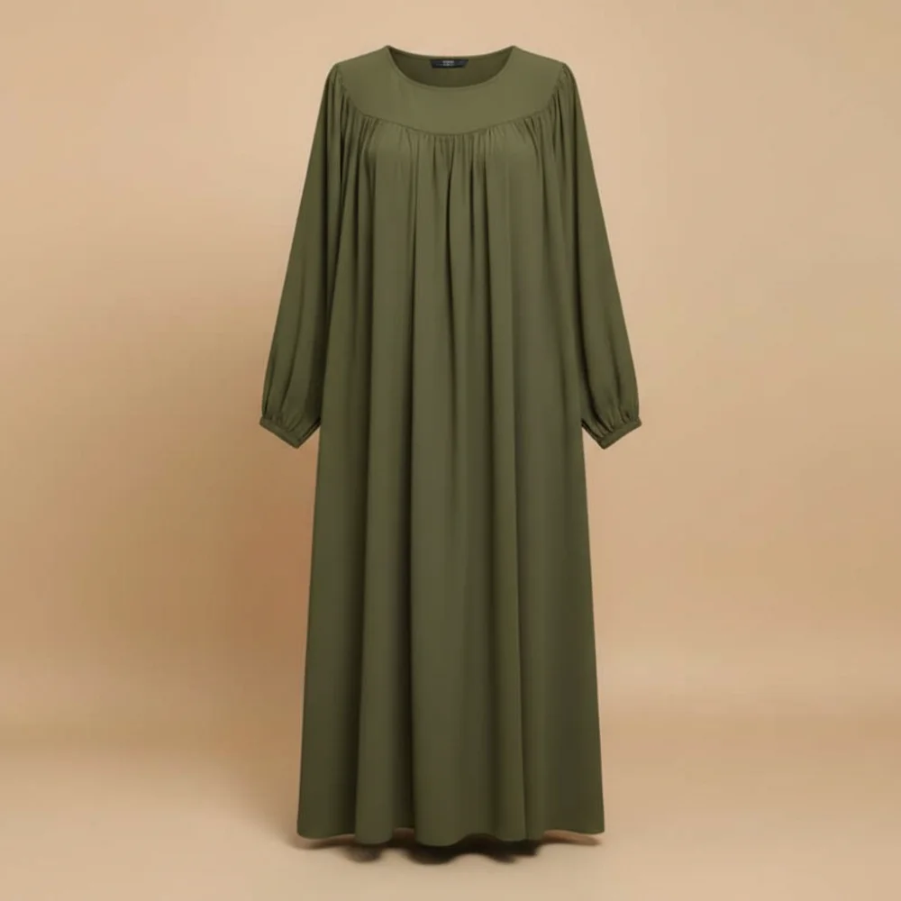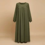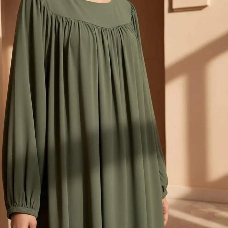 الياقة دائرية بسيطة وواسعة ما تضيقش على الرقبة، والكسرات من الصدر تعطي حرية حركة وشكل مرتب بدون ما تكون ضيقة. الأكمام طويلة وتنتهي بمطاط (Elastic) يخليها مريحة وعملية، خصوصًا في الاستعمال اليومي أو الخرجات.