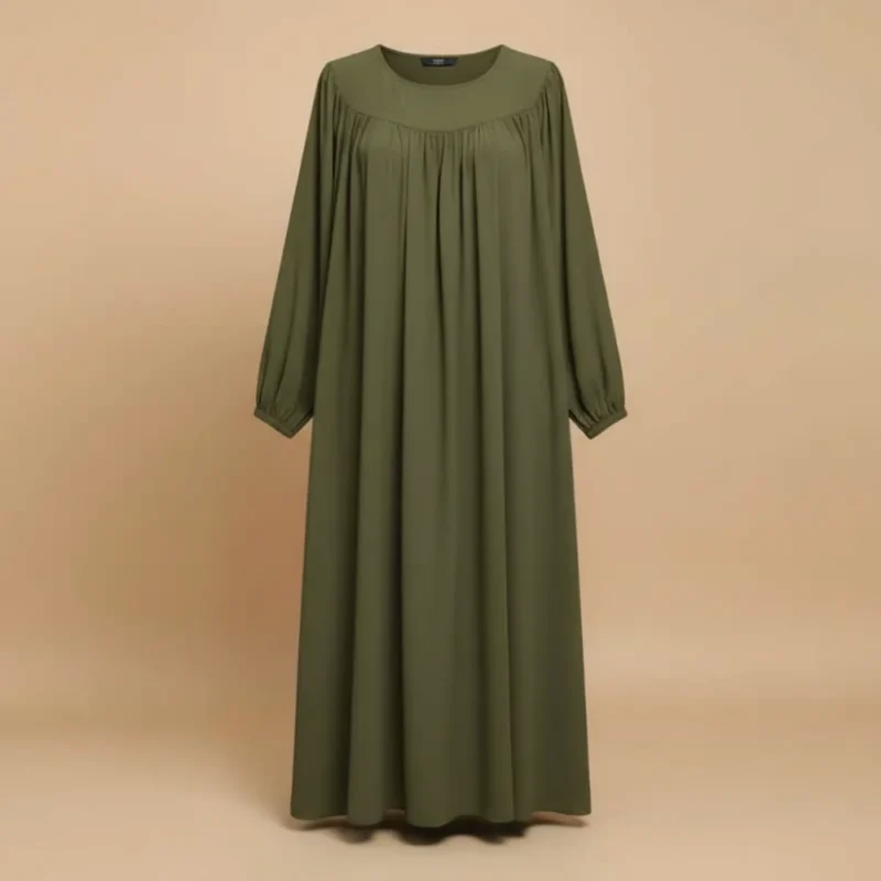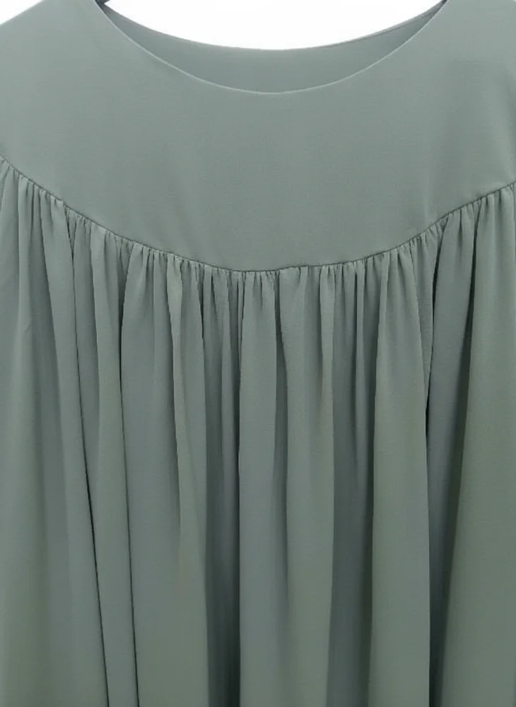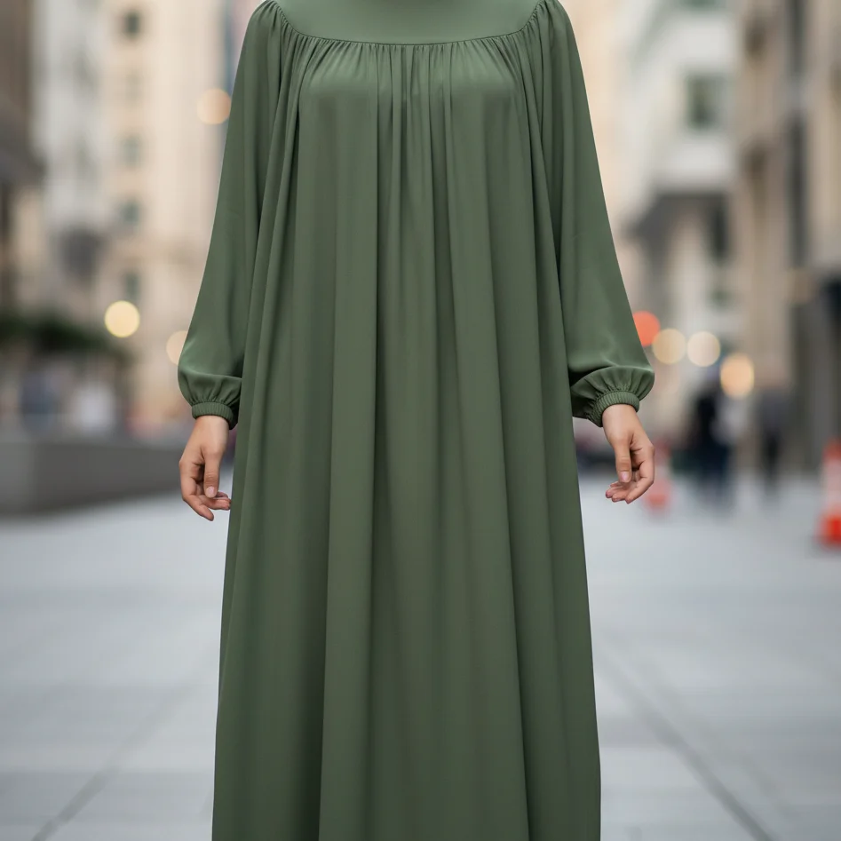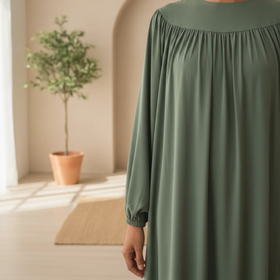حجاب بقصة دائرية مميزة من قماش برادا الفاخر، يعطي انسياباً واسعاً من الأسفل مع ياقة بسيطة ومريحة. تصميم عملي مع كسرات من الأعلى وأكمام بمطاط تسهل الحركة طول اليوم.