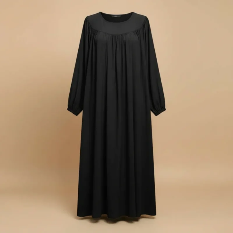 حجاب بقصة دائرية مميزة من قماش برادا الفاخر، يعطي انسياباً واسعاً من الأسفل مع ياقة بسيطة ومريحة. تصميم عملي مع كسرات من الأعلى وأكمام بمطاط تسهل الحركة طول اليوم.