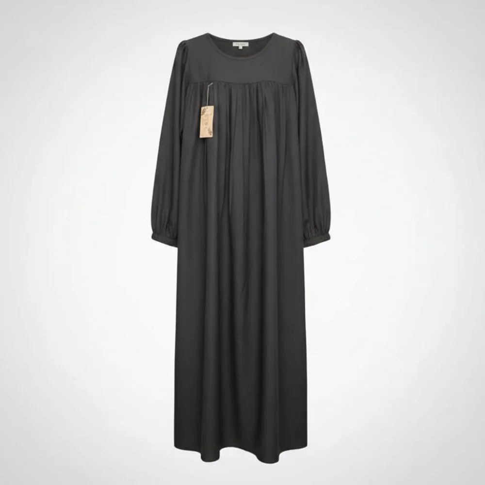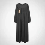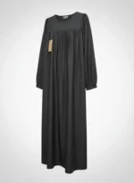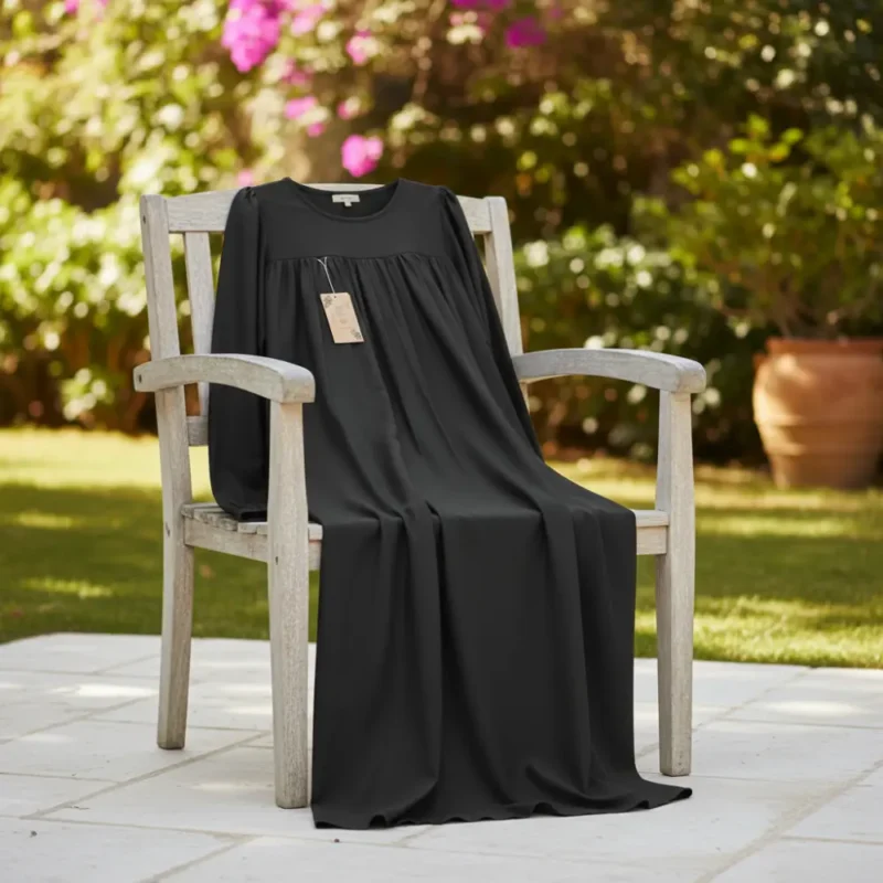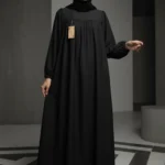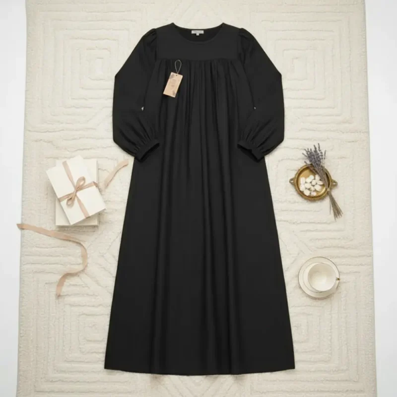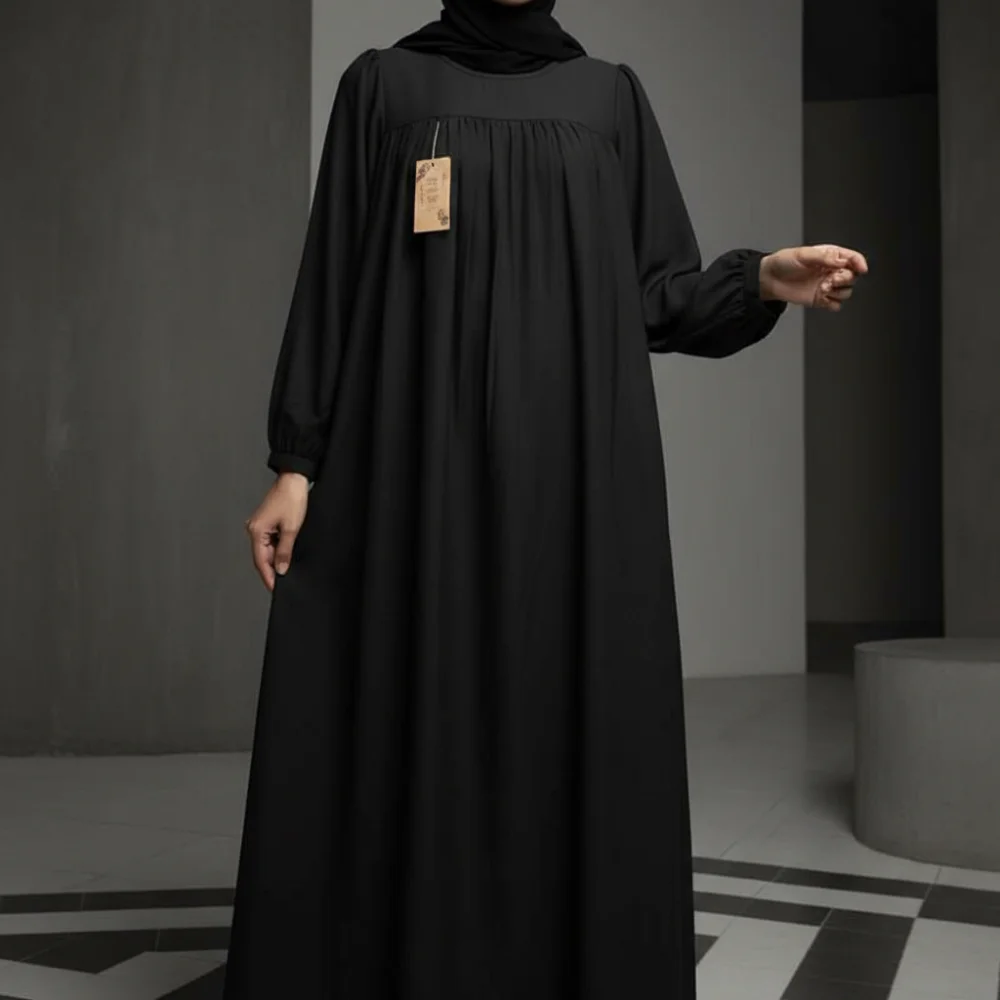 حجاب بسيط وعملي من قماش برادا، بقصّة واسعة وانسيابية تعطي راحة في اللبس طول اليوم. تصميمها يعتمد على كسرات من الأعلى لسهولة الحركة، وأكمام تنتهي بمطاط لتكون مريحة في الاستعمال اليومي.