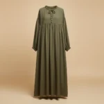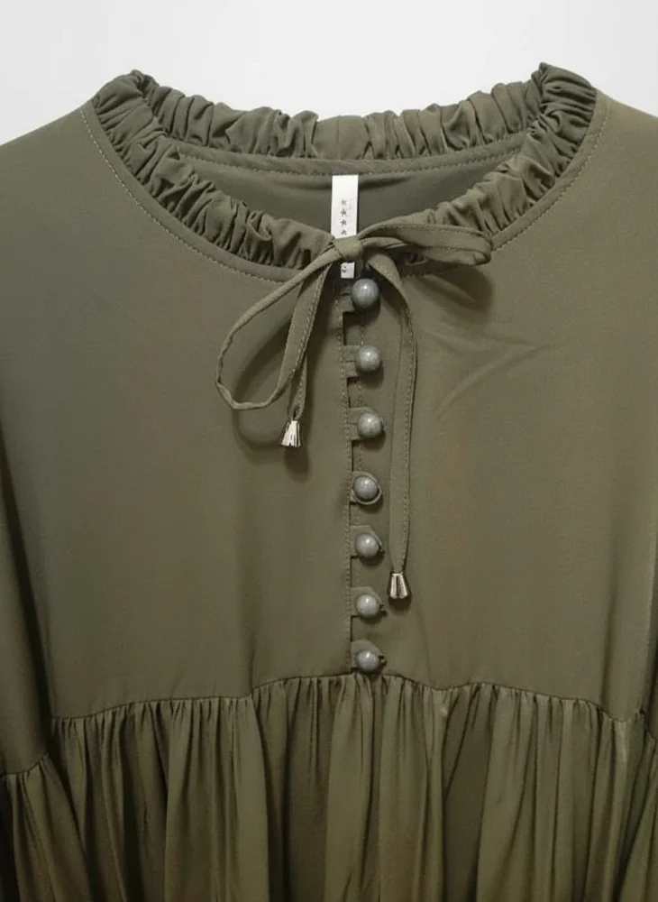 - أزرار أمامية أنيقة: صف من الأزرار المغلفة بنفس القماش يمتد على الصدر، ليضيف لمسة فنية دون المبالغة في الزينة.