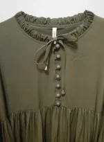 - ياقة مميزة (Col Froncé): تصميم الياقة المزمومة مع رباط ناعم يمنحك مظهراً أنثوياً فريداً ويغنيك عن إضافة إكسسوارات حول الرقبة.