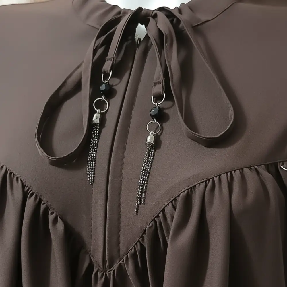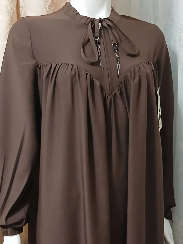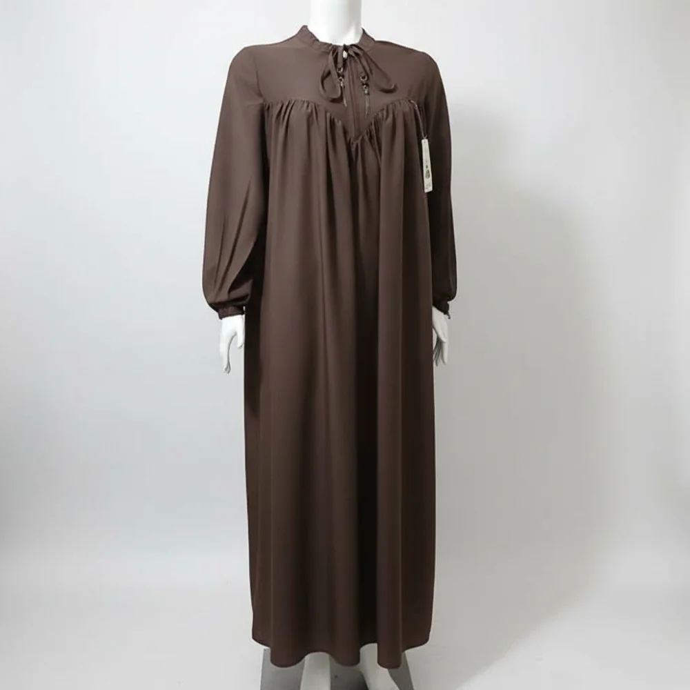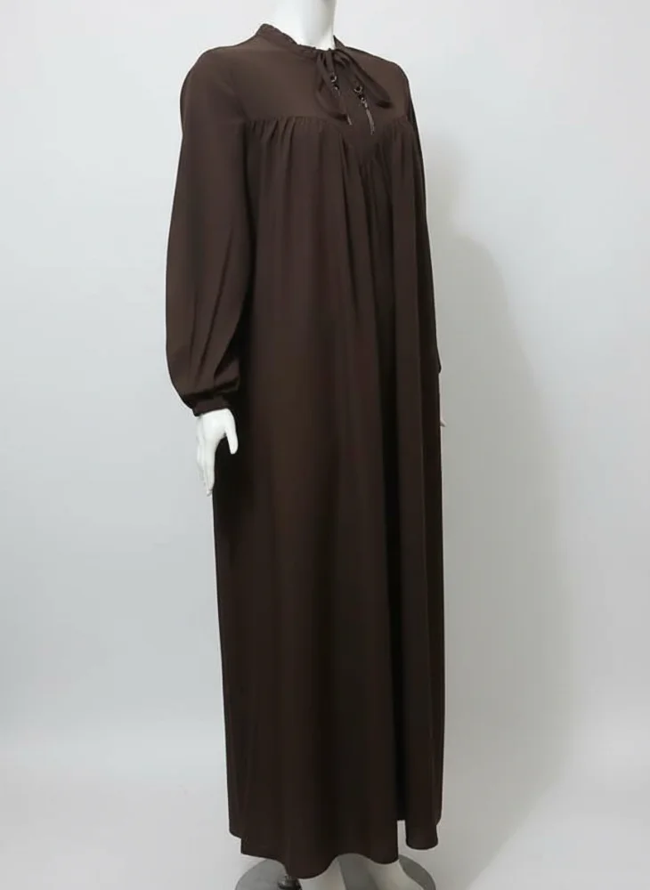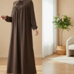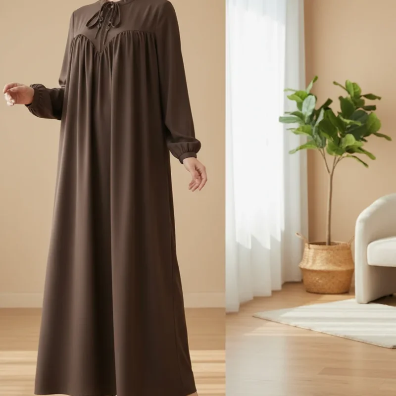 حجاب بتصميم محتشم، يتميز بربطة عند الرقبة مع كسرات في الصدر وأكمام طويلة.