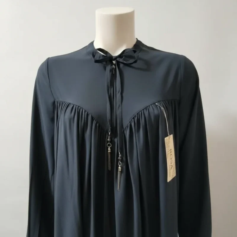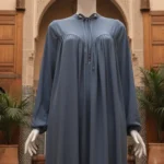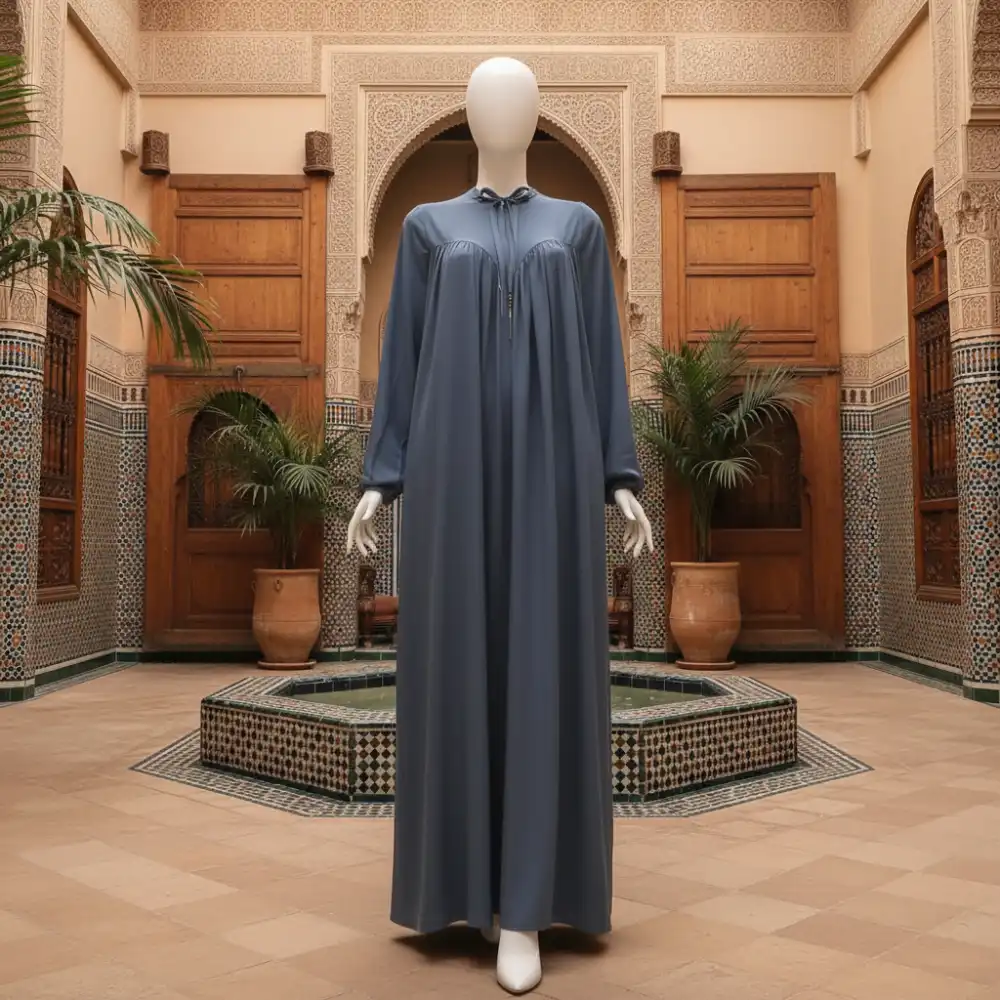 حجاب بتصميم محتشم، يتميز بربطة عند الرقبة مع كسرات في الصدر وأكمام طويلة.