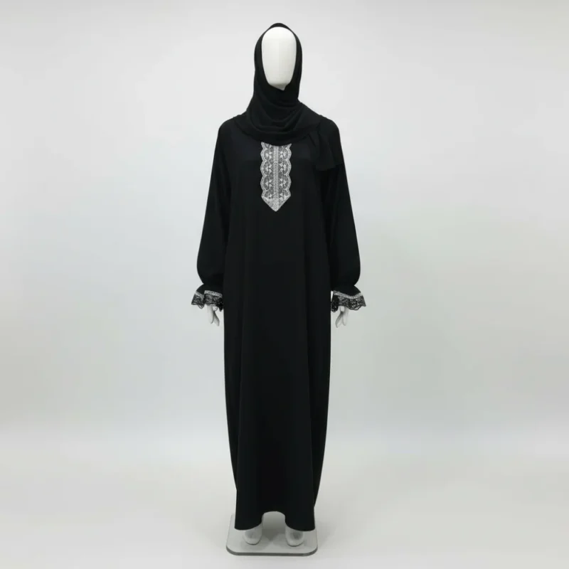 - الروبة: قصة فضفاضة جداً تغطي الجسم بالكامل، مع دانتيل أبيض مطرز على الصدر بشكل رقيق (يشبه الكرافات)، وكمام واسعة تنتهي بدانتيل مزخرف يضفي لمسة أنيقة دون مبالغة.