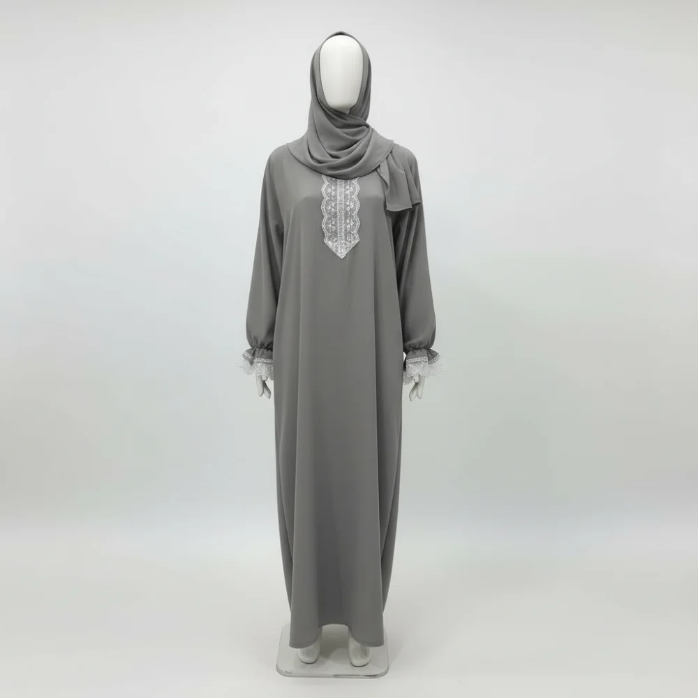 طقم صلاة عملي وأنيق من قماش الكريب المجعد، يوفر راحة تامة أثناء السجود والصلاة. يتكون من قطعتين: روبة واسعة مزينة بدانتيل أبيض راقي على الصدر والأكمام، مع خمار منفصل