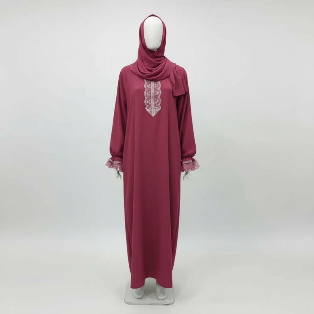 طقم صلاة عملي وأنيق من قماش الكريب المجعد، يوفر راحة تامة أثناء السجود والصلاة. يتكون من قطعتين: روبة واسعة مزينة بدانتيل أبيض راقي على الصدر والأكمام، مع خمار منفصل