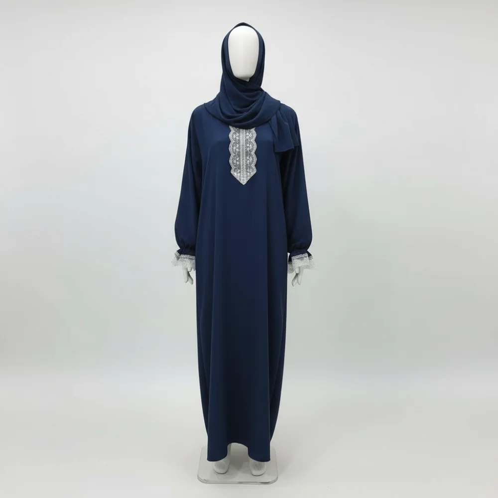 طقم صلاة عملي وأنيق من قماش الكريب المجعد، يوفر راحة تامة أثناء السجود والصلاة. يتكون من قطعتين: روبة واسعة مزينة بدانتيل أبيض راقي على الصدر والأكمام، مع خمار منفصل
