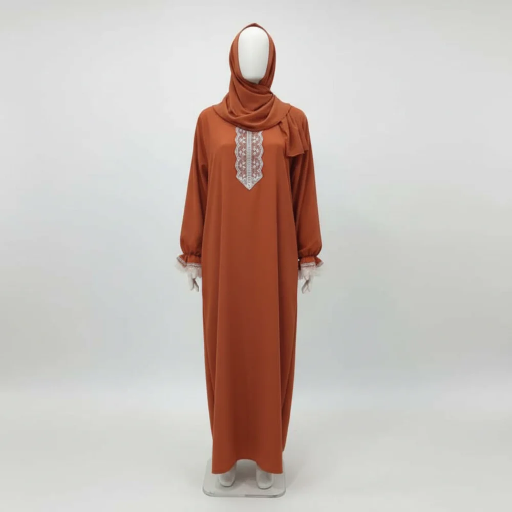 طقم صلاة عملي وأنيق من قماش الكريب المجعد، يوفر راحة تامة أثناء السجود والصلاة. يتكون من قطعتين: روبة واسعة مزينة بدانتيل أبيض راقي على الصدر والأكمام، مع خمار منفصل